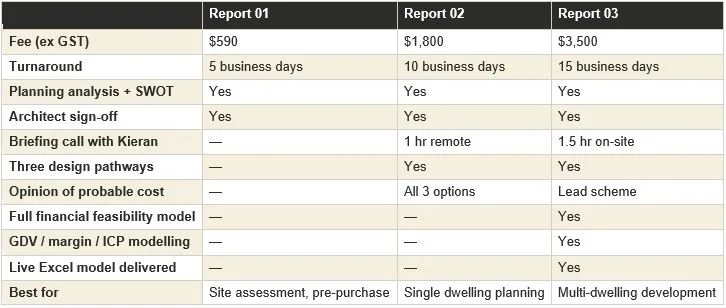 Each report is prepared by in house by our team and reviewed personally by founding director Kieran Bast and delivered as a polished, document — ready to share with your builder, financier, or town planner. All reports require 50% fee payable on commencement with balance upon completion
